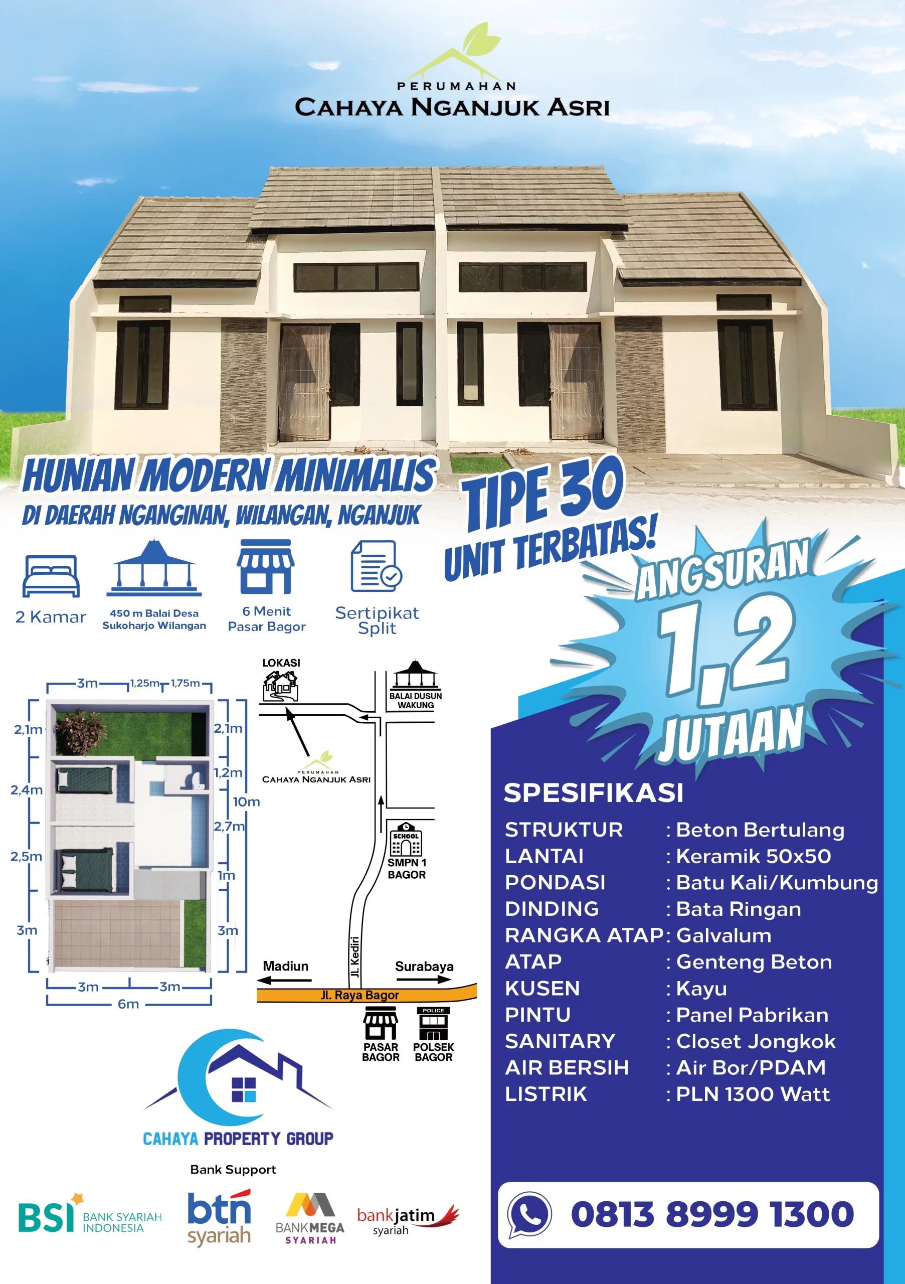 Perumahan Cahaya Nganjuk Asri merupakan perumahan subsidi, yang berlokasi dí Nganginan, Wilangan, Nganjuk